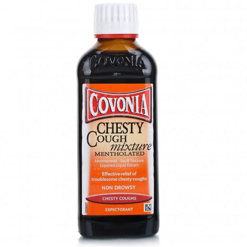 Covonia Chesty Cough Mixture Mentholated relieves the symptoms of chesty coughs and sore throats.